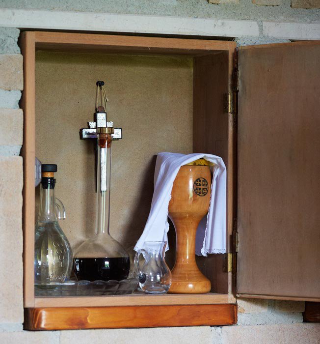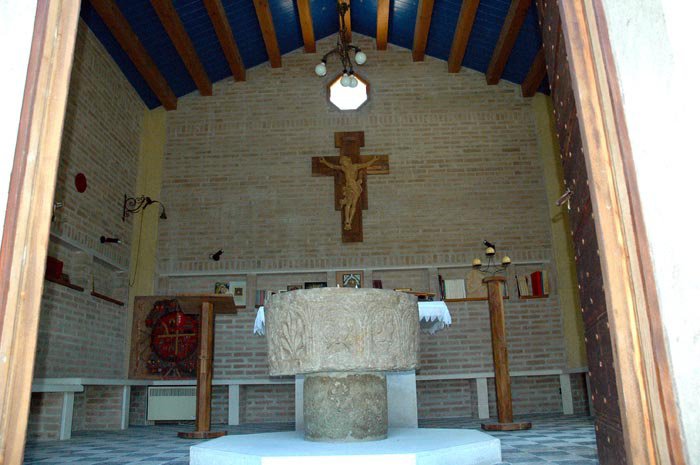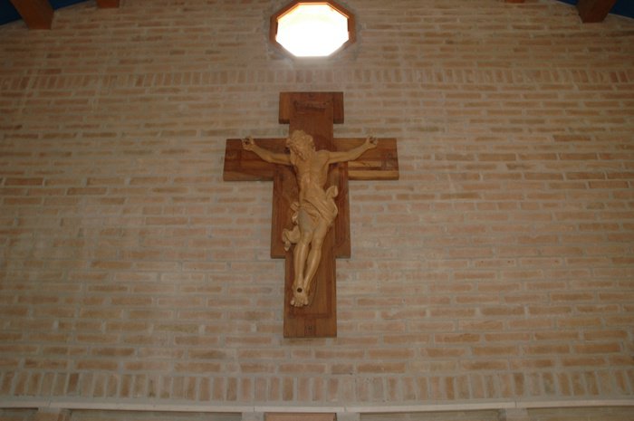 Walter Trevisi è l'artista del legno che ha eseguito l'opera, intagliando da un unico pezzo ligneo di tiglio, il meraviglioso Cristo, che posto di fronte al battistero romanico veglia su tutta l'Umanità dalle Colline del Mondragon. La Croce che regge il Cristo si ispira al pari dell'intero edificio al tema dell'ottagonalità gerosolimitana.