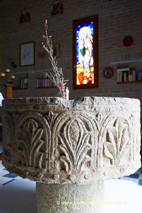 I lucernari, come pure il basamento della magnifica vasca battesimale romanica in trachite euganea, risalente alla seconda metà del XII secolo, pervenuta iure successionis alla famiglia Riponti, ben descritta da Mons. Antonio Moret nei suoi studi, richiamano la simbologia ottagonale, di centrale rilievo per la nostra Fede, in quanto espressiva della figura del Cristo, che media, attraverso la Resurrezione, lo Spirito (il cerchio) con la materia (il quadrato).