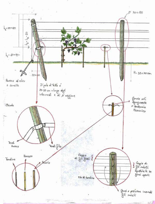 Tale tipologia d'impianto prevede il palizzamento verso l'alto dei germogli uviferi e, nelle condizioni del sito in esame, ne migliora l'equilibrio vegeto-produttivo. La distanza tra un filare di un ripiano e quello del ripiano successivo (parte in pendenza) è di circa 2,4 m, mentre le viti sono poste a 80 cm sulla fila. Dal punto di vista strutturale il filo portante per il cordone permanente è stato collocato a circa 80 cm dal suolo e con altezza dei pali fuori terra di 1,70 m per garantire lo sviluppo di una sufficiente parete fogliare (130 cm di parete) e mantenere su quasi tutti i germogli uviferi un quantità di foglie sufficienti ad una buona maturazione dell'uva.